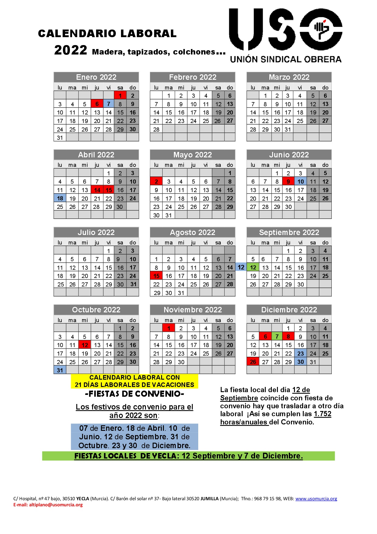 Calendario laboral del sector de la madera de la Región de Murcia (en esta caso junto con los festivos locales de Yecla)