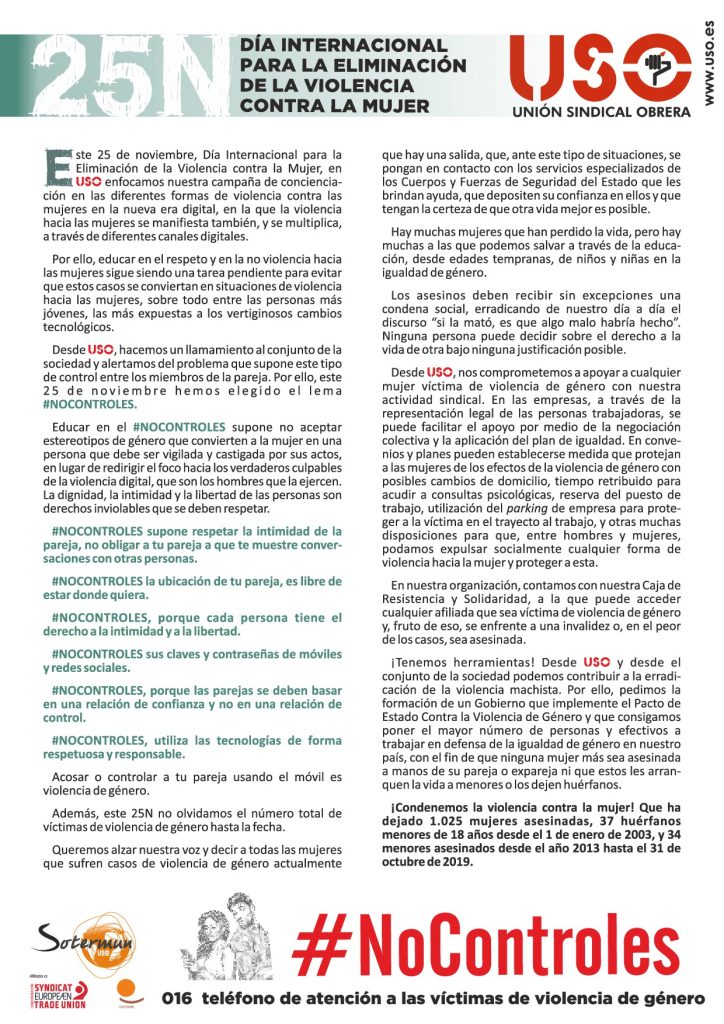 Este #25N, Día Internacional para la eliminación de la violencia contra la mujer, desde USO Región de Murcia nos sumamos a las convocatorias regionales y centramos nuestra campaña en el control de redes en la pareja, con el lema #NoControles, porque controlar a tu pareja a través de redes o móvil es #ViolenciaDeGenero