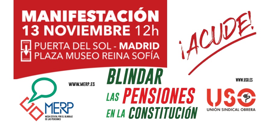 Como sabéis el día 13 de noviembre desde USO como miembros de la MERP somos convocantes de la manifestación por el blindaje de las pensiones que va a tener lugar en Madrid a las 12h. Desde la Comisión Ejecutiva Confederal hacemos un llamamiento a la participación de todas las Uniones y Federaciones, si es posible, en coordinación con otras organizaciones de la MERP en los territorios y, en caso de que no se pueda, con delegaciones solo de USO. Debido a que es una convocatoria conjunta y a que se pueden dar diferentes situaciones, os trasladamos los siguientes criterios económicos para cubrir los gastos básicos de esta convocatoria: