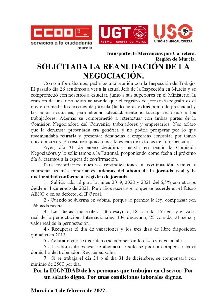 Comunicado de la plataforma conjunta de sindicatos por el convenio del transporte de mercancías por carretera de la Región de Murcia.